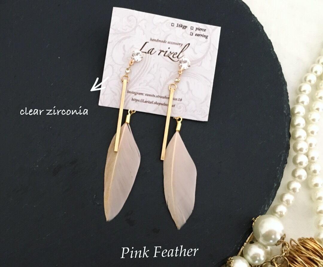 パステルカラーのフェザーを使った2wayピアスです。こちらは、 キラキラジルコニアが2つついています。1つは耳元で光る、クリアホワイト。そして、もう1つはクリアホワイトとゴールドスティックを繋ぐ小さなジルコニアストーンです。