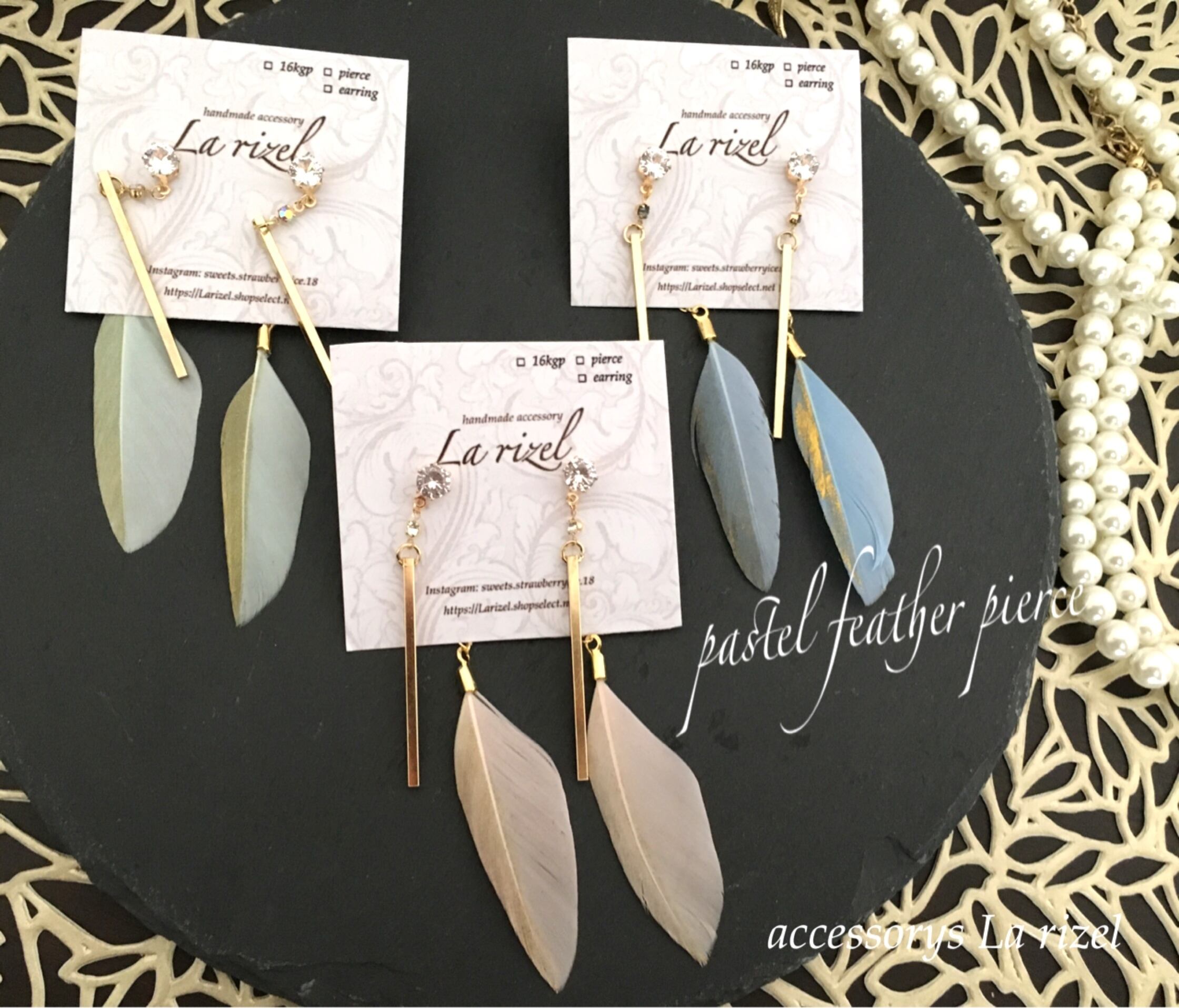 実は、フェザーも2カラーになっていて、mint green×gold、blue×gold、pink×goldの為、優しい色合いだけれど、バッチリ夏にも使えそうな、春夏大活躍のピアスです。